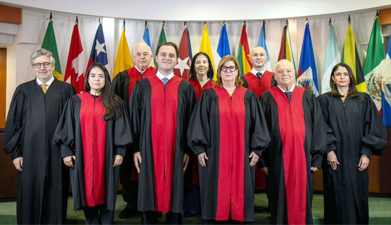 Primera fila, de izquierda a derecha: Jueza Verónica Gómez; Juez Rodrigo Mudrovitsch, Vicepresidente; Jueza Nancy Hernández López, Presidenta; y Juez Ricardo C. Pérez Manrique. Segunda fila, de izquierda a derecha: Secretario Pablo Saavedra Alessandri y Secretaria Adjunta Gabriela Pacheco Arias. Tercera fila, de izquierda a derecha: Juez Alberto Borea Odría, Jueza Patricia Pérez Goldberg y Juez Diego Moreno Rodríguez.