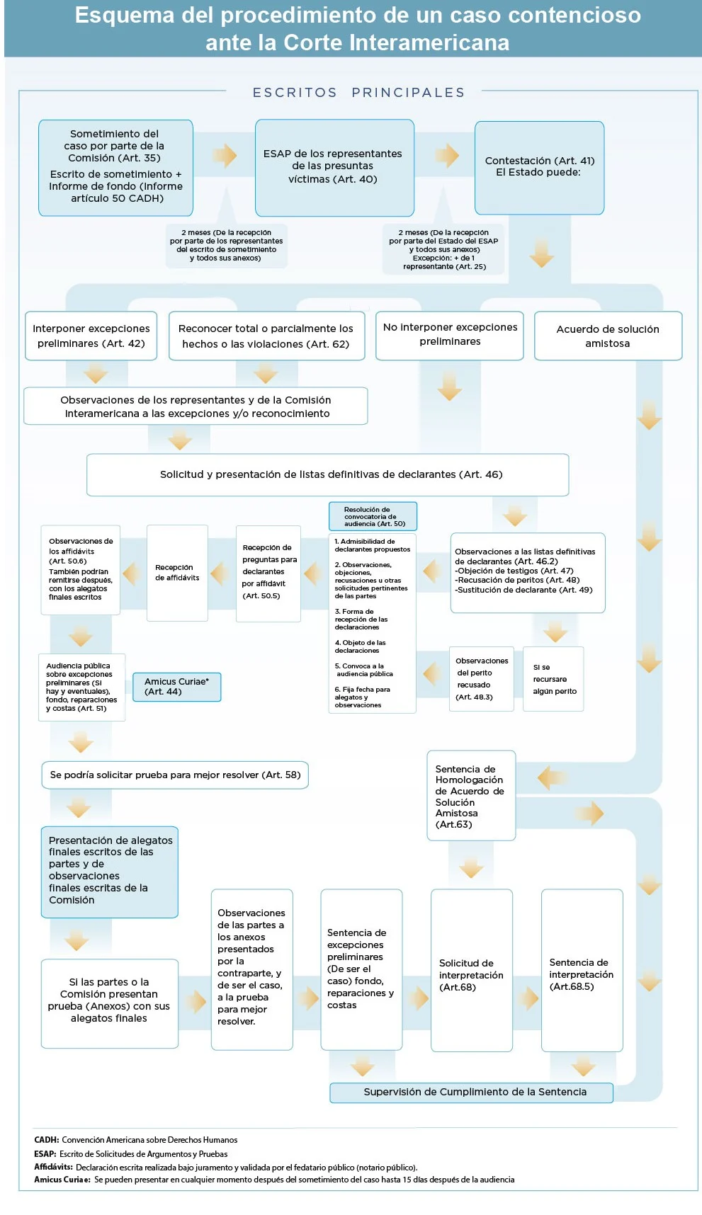 En el marco de la competencia contenciosa del Tribunal el proceso de elaboración de una sentencia comprende varias etapas que combinan la naturaleza escrita y oral. La segunda etapa, esencialmente oral, se expresa en la audiencia pública sobre cada caso que suele durar aproximadamente un día y medio. En dicha audiencia la Comisión expone los fundamentos de la presentación del caso ante la Corte, y de cualquier otro asunto que considere relevante para la resolución del mismo.
